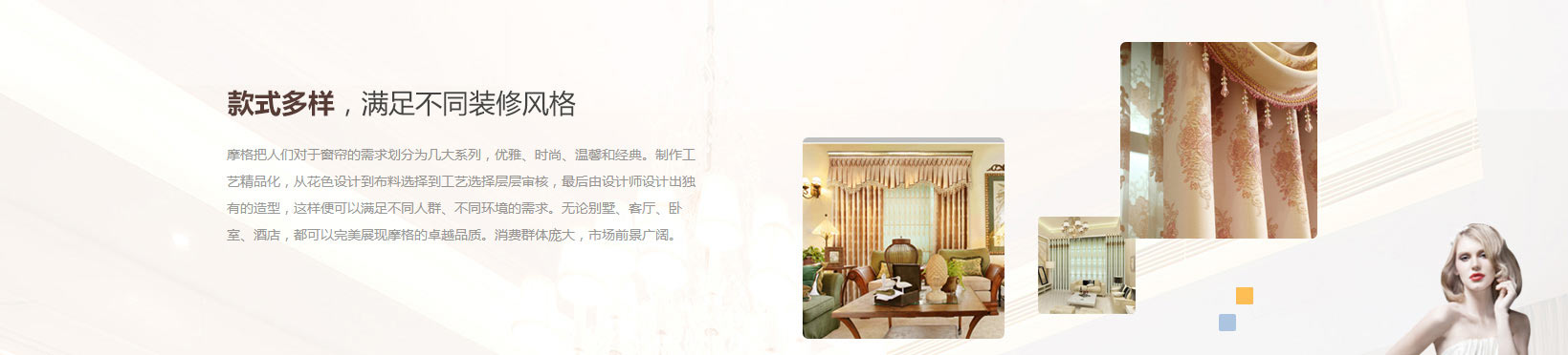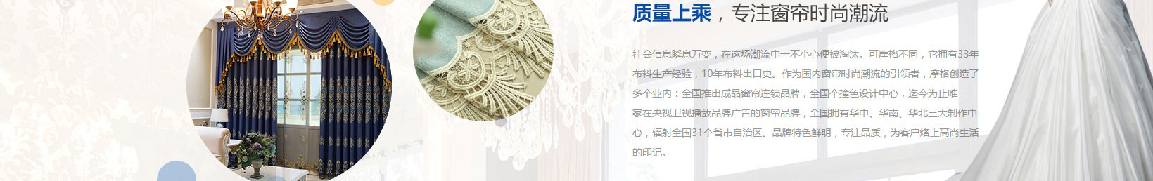 取源於中華悠久紡織文化的羞羞视频在线免费观看(MOONGOOL)品牌,始終堅持“健康、時尚、精致”的產品觀,引領軟裝布藝行業進入高品質生活。產品設計風格融入歐式低調奢華元素及國際流行時尚趨勢,先後開發了古典巴洛克、簡約洛可可、經典中式(新中式)、時尚地中海、免费羞羞视频APP、唯美美式、原木風、奶油風、羞羞网站入口簡約風九大風格係列產品,擁有各種花型、工藝、材料麵料達1500餘種。其中窗簾產品作為羞羞视频在线免费观看核心產品頗受消費者青睞。采用高精密、棉麻、雪尼爾等上千種布料的羞羞视频在线免费观看窗簾用高端的新興工藝製作,絨麵柔軟,織物華麗,九大截然不同的風格同時搭配種類繁多的布類花型和不同的製造工藝,顏色或豔麗或素雅或大氣,簡約而不簡單。無論哪一款窗簾,都在注解不一樣的故事,也詮釋著自己的絕佳格調。正因為如此,個性獨特和創新思維賦予羞羞视频在线免费观看更多的市場商機。