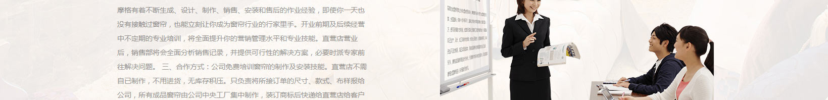 形象支持:終端(專賣店、店中店)賣場形象統一由公司工程部免費設計;並派區域經理實地指導、調研; 終端宣傳形象由公司設計部統一設計、規劃; 陳列督導親臨現場輔導賣場布設陳列,以此確保統一形象標準。